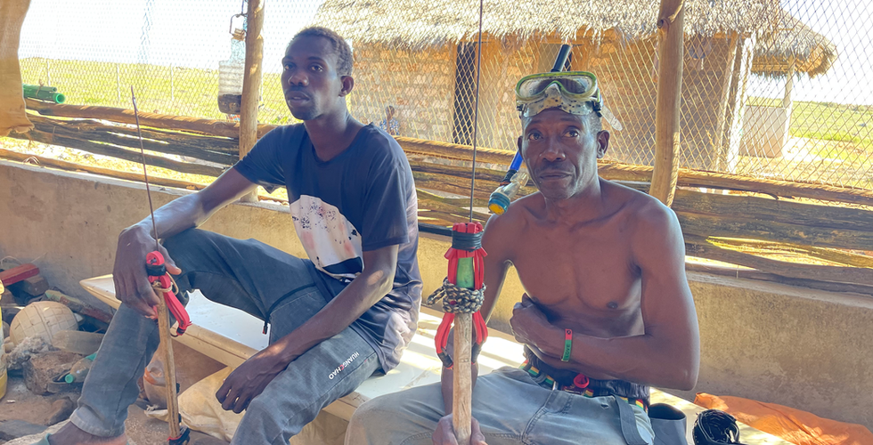 Barak and Charo, two dedicated Kwa Chambo fishers, pose inside the fishers' store room holding their handmade spearguns — a glimpse into the ingenuity and resilience of small-scale fishing culture along Kenya’s coast.